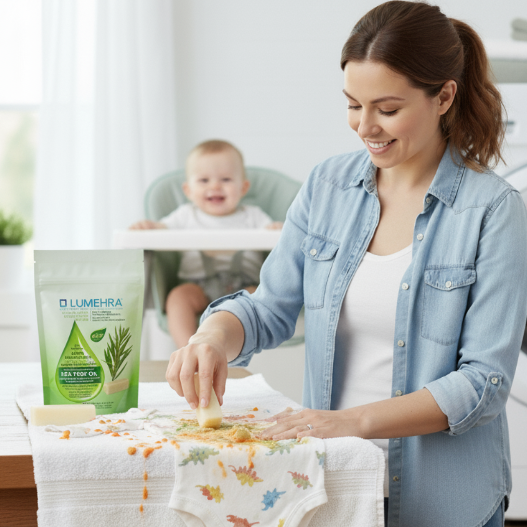 Lumehra’s Stain Remover Bar is a zero-waste alternative to liquid and spray removers. Compact, long-lasting, and biodegradable, it’s safe for septic systems and formulated for sensitive skin—perfect for families.